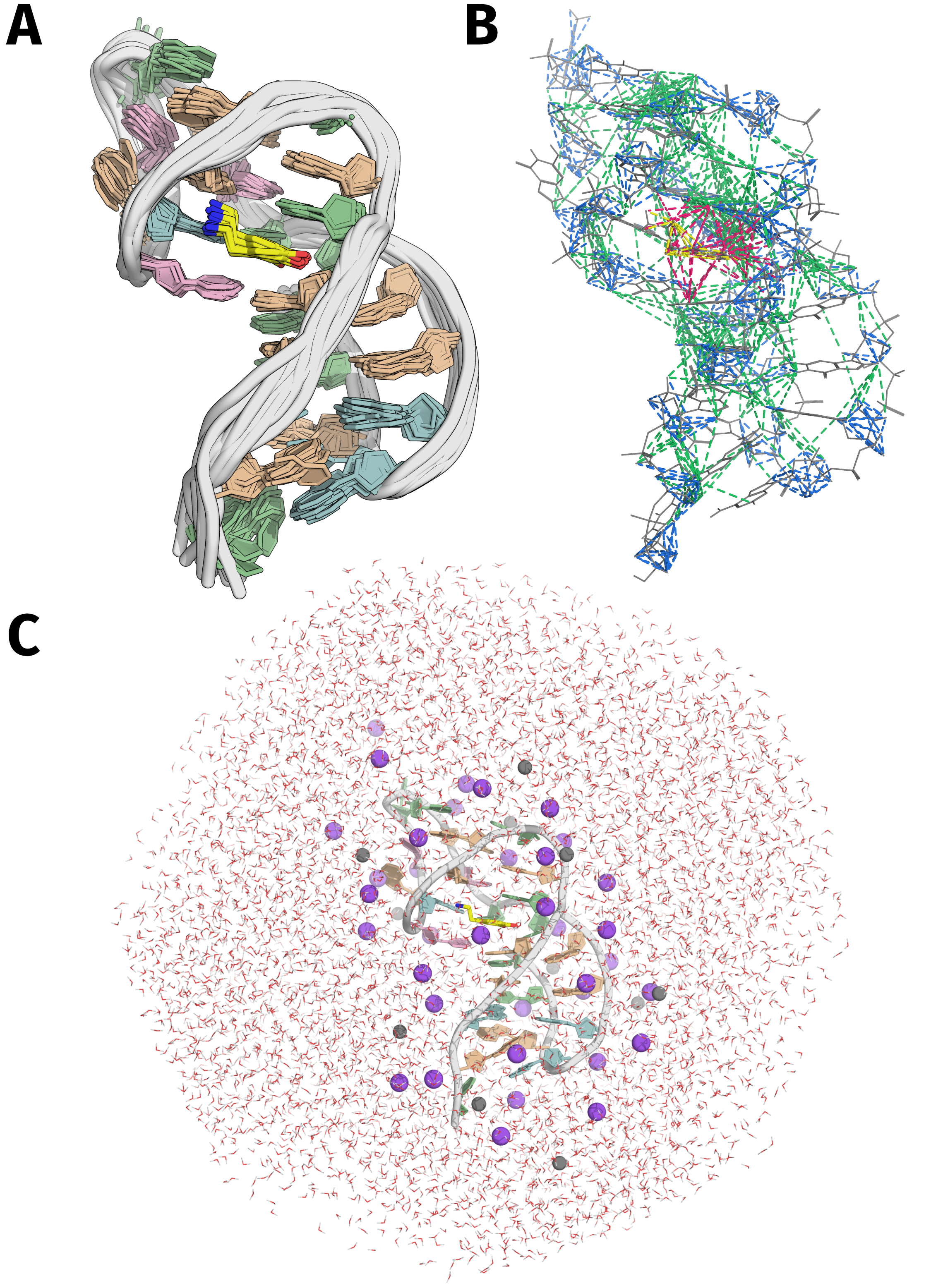 makeDIST_RSTd’Amber a ensuite permis de générer le fichier de contrainte pour les simulations. De plus, un fichier de mapping a été préparé pour définir des noms communs pour les groupes de protons partageant une contrainte donnée (par exemple, les 3 atomes d’hydrogène du méthyl d’une thymine). Cette étape peut paraître triviale, mais sa semi-automatisation est garante de sa robustesse et un gain de temps significatif. Elle est également essentielle pour que la simulation ait lieu en tenant compte des données expérimentales. La figure Figure 5.39B illustre l’exhaustivité de ces contraintes.Préparation du système à l’aide du programme