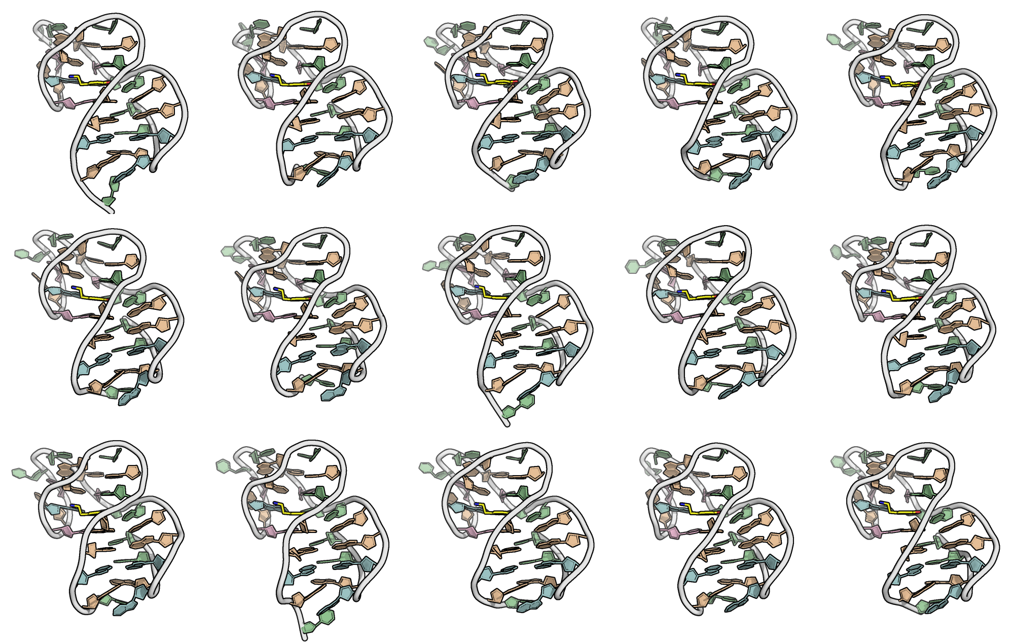 Les chaînes latérales peuvent se lier au squelette phosphate de façon transitoire et sont globalement très dynamiques, à l’instar des dT en 5’ et 3’, ce qui justifie leur absence dans le modèle cristallographique.