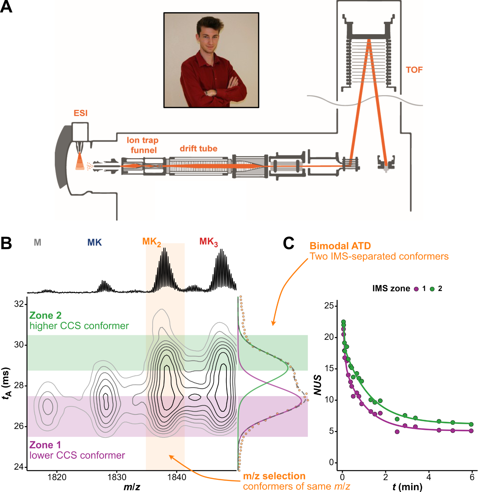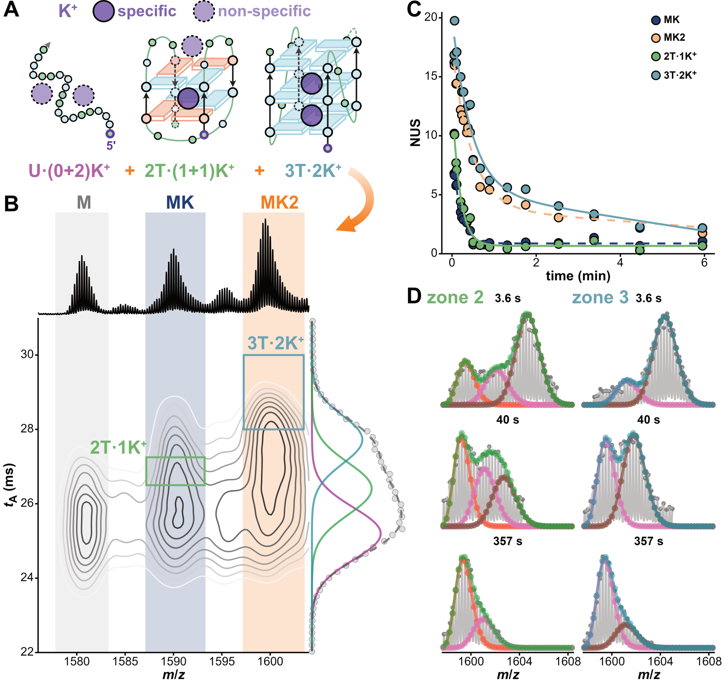 Il existe plusieurs façon de réaliser une séparation IMS. Ici, on utilise un spectromètre de masse équipé d’un tube de dérive (Figure 5.9A). Brièvement, les ions d’oligonucléotides générés dans la source du spectromètre de masse sont introduits par paquet dans le tube de dérive contenant un gaz (généralement de l’azote, mais ici de l’hélium). Lorsque les ions se déplacent dans le tube, par application d’un champ électrique, ils entrent en collision avec le gaz, ce qui ralentit leur mouvement en fonction de leur section efficace de collision (schématiquement, les plus gros ions sont davantage ralentis). Différents conformères peuvent donc être séparés en fonction de leur mobilité ionique, avant d’atteindre le détecteur du spectromètre de masse [7]. Cela vient s’ajouter à la séparation en masse, où l’on prend toujours soin de conserver les interactions non-covalentes intacts. Ainsi, dans la Figure 5.9B, les conformères sont séparés par masse sur l’axe des abscisses et par IMS sur l’axe des ordonnées. Les cinétiques d’échange de la Figure 5.9C ont été déterminées par sélection en masse de l’espèce liant 2 K+ (MK2, orange), pour laquelle on a séparé deux conformères par IMS (vert et violet).