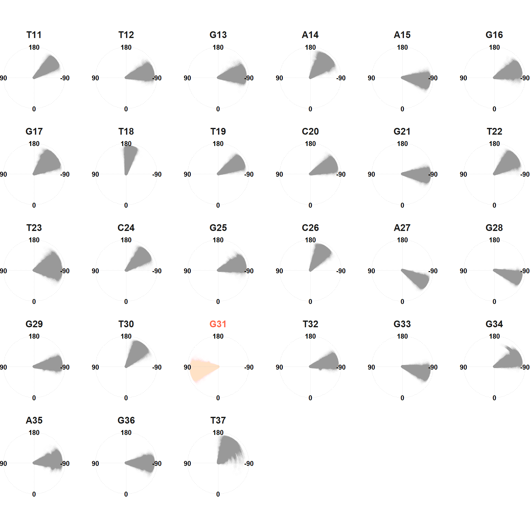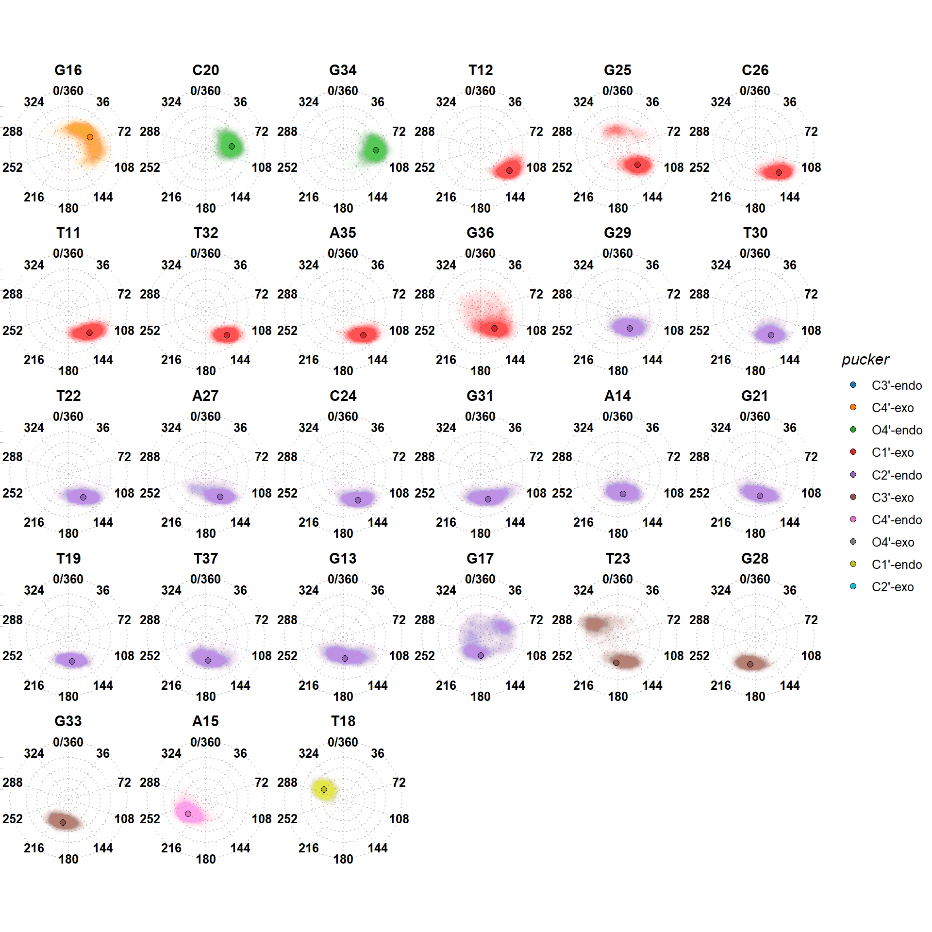 Dans le contexte de l’étude de structures non-canoniques, il est fréquent de mesurer des angles dièdres, notamment celui des liaisons glycosidiques \(\chi\) (correspondant au GBA dans la Section 5.4.1 ; Figure 5.42) et de torsion des sucres (pucker \(P\) ; Figure 5.43). J’ai développé des fonctions en R qui permettent de rapidement calculer chaque angle pour chaque nucléotide pour chaque set coordonnées extrait de la trajectoire (ici, 25000 ; Figures 5.42, 5.43). En particulier, \(P\) et son amplitude ont été calculés avec les équations 5.20 et 5.21, respectivement, en utilisant les angles de torsion \(\nu_i\) (atomes définis dans les équations 5.22–5.26).