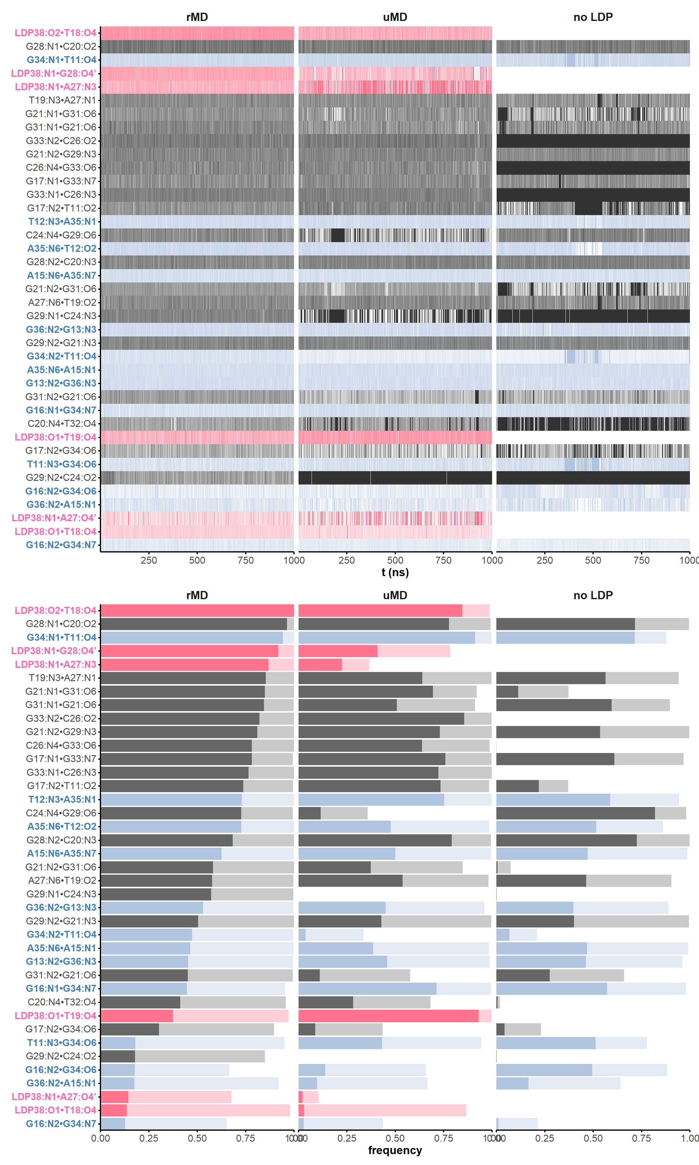 La thématique la plus récente que j’ai abordée, et la première initiée dans l’équipe PRISM, est l’implémentation de calculs de dynamiques moléculaires (MD) de structures d’acides nucléiques non canoniques, avec deux objectifs. Le premier, celui qui a amené l’énergie d’activation nécessaire à l’initiation de ce travail, est l’utilisation de dynamiques moléculaires contraintes (rMD), par les données RMN, comme dernière étape dans la résolution de structures d’acides nucléiques par RMN, avant dépôt sur la PDB. Le second objectif est l’utilisation de MD pour mieux comprendre, ou anticiper, des résultats expérimentaux. En particulier, je présente dans ce document des applications sur des complexes G4/petites molécules (Sections 5.3.1.1, ci-avant, et 5.6.4).