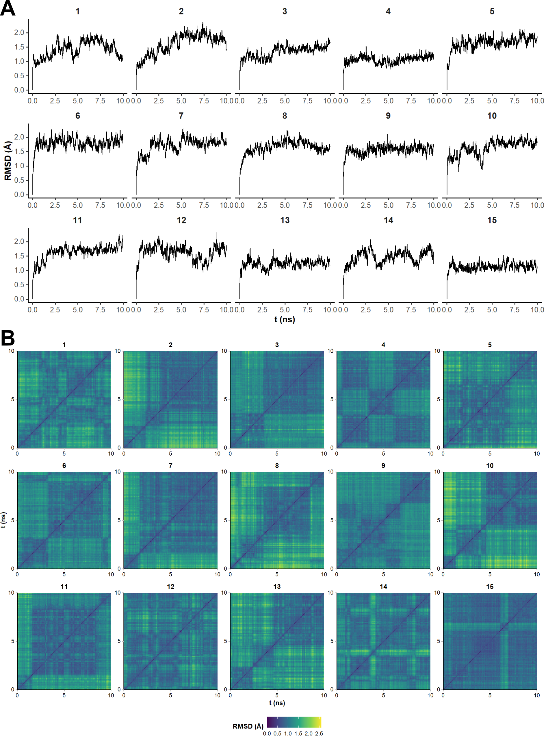 Je présente ici quelques exemples d’exploitation typique des résultats, afin d’illustrer le flux de travail mis en place. Par exemple, il est courant d’analyser l’évolution temporelle de la RMSD pour évaluer la stabilité d’une simulation de dynamique moléculaire (Figure 5.41A). Ce type de représentation montre les fluctuations structurales de chaque conformère par rapport à la conformation initiale. Toutefois, ces figures peuvent prêter à confusion : deux conformères présentant une même valeur de RMSD ne sont pas nécessairement similaires. Ils sont simplement à une distance comparable du modèle de référence, mais peuvent différer considérablement l’un de l’autre. Pour pallier à ce biais de visualisation, je privilégie les représentations sous forme de matrices de similarité (des heatmaps dites pairwise RMSD ; Figure 5.41B), où chaque conformation est comparée à toutes les autres, offrant une vision plus complète de l’espace conformationnel échantillonné pendant la simulation. Ces figures permettent notamment de repérer facilement la formation de clusters structuraux au cours de la simulation, visibles par l’apparition de zones carrées le long de la diagonale.