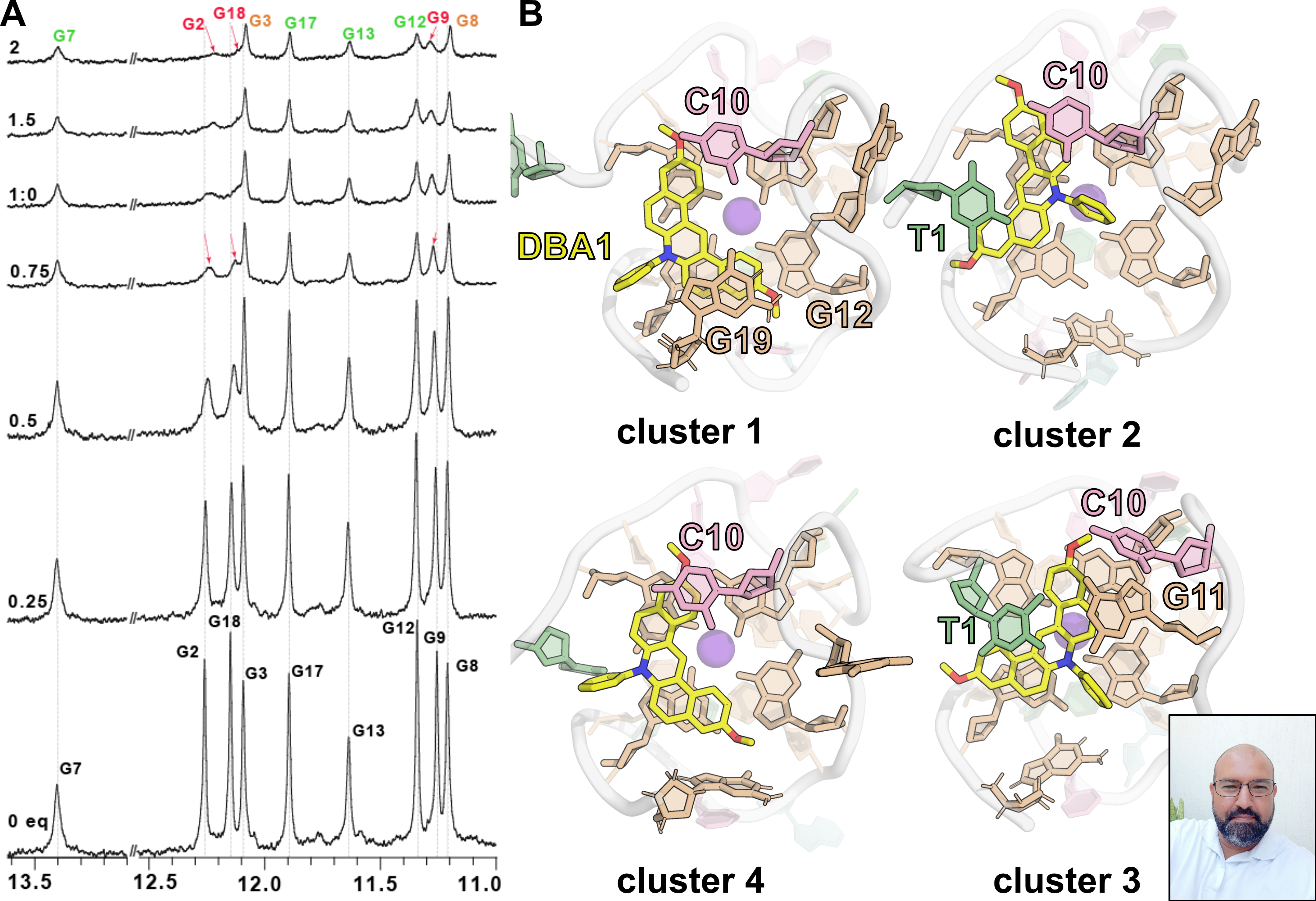 Samir a montré par RMN que le dérivé DBA1 interagit avec la tétrade G2·G9·G12·G18 du G4 HIVpro1, en particulier avec G2, G9 et G18 (Figure 5.47A). Il lui fut alors suggéré par un pair de procéder à des expériences de docking pour déterminer plus précisément le mode d’interaction. S’il paraît très probable à ce stade que le ligand est stacké sur la tétrade, son orientation et la position de la charge positive sont inconnues.