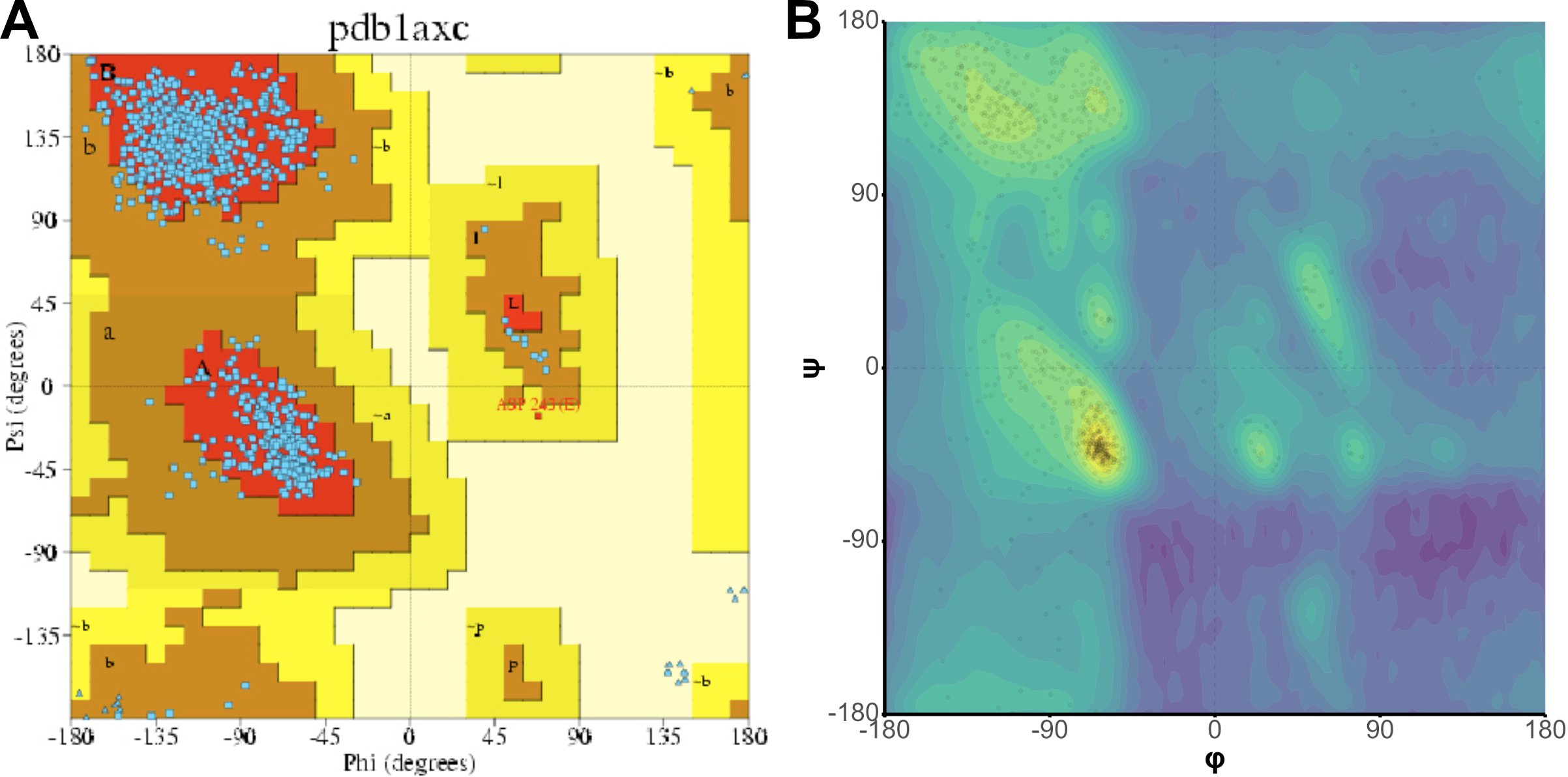 Petite digression : la détermination d’angles dièdres, notamment \(\phi\) et \(\psi\), est également d’intérêt pour la validation de structures protéiques. Cette validation repose sur l’utilisation de serveurs web qui comparent les valeurs soumises à un set de référence d’angles “autorisés”, dont la provenance n’est pas toujours claire (Figure 5.44A). La mise en place d’analyse “maison” permet de sélectionner les données et leur analyse plus convenablement, ce que j’ai mis en place au laboratoire (Figure 5.44B).