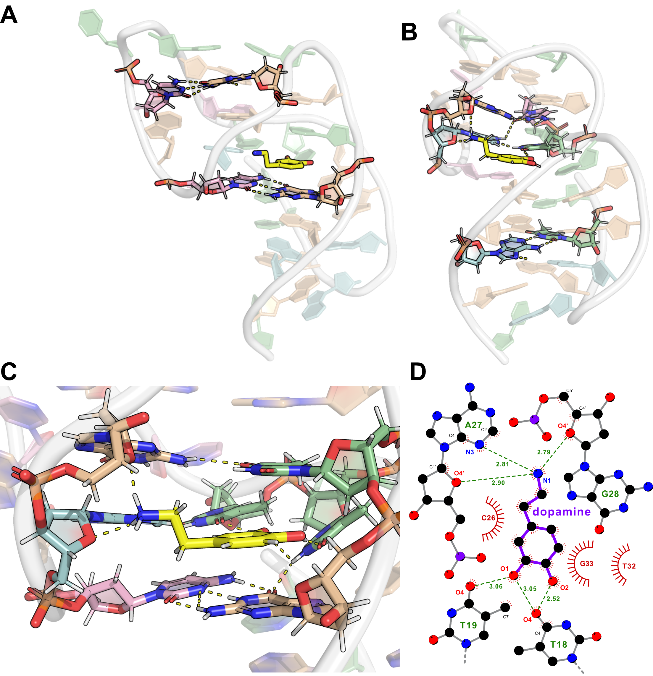 Ici, le complexe RKEC1·dopamine est remarquablement non canonique. Seules deux paires de bases respectent la géométrie Watson-Crick (Figure 5.46A). En plus des paires de bases non canoniques (Figure 5.46B), plusieurs triplets de bases, pas forcément coplanaires, sont formés, rendant la structure franchement bizarre.